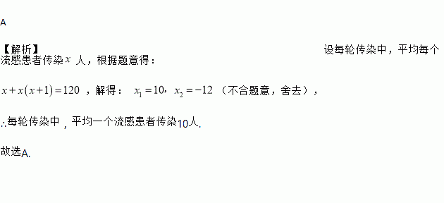 有一个人患了流感,经过两轮传染后新增120个人患了流感,则每轮传染中平均一个流 感患者传染人的个数为( )