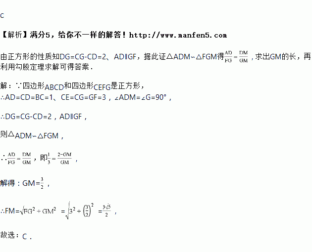 如图,在正方形ABCD和正方形CEFG中,点D在CG上,BC=1,CE=3,连接AF交CG于M点,则FM=( )