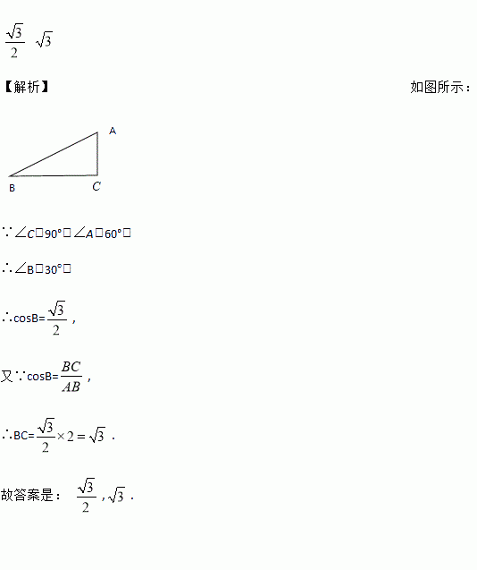 在Rt△ABC中,∠C=90°,∠A=60°.若AB=2,则cosB=________,BC=________.