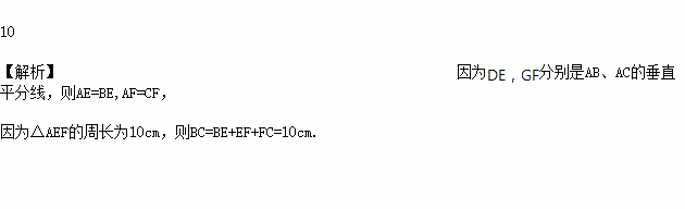 如图,在△ABC中,AB、AC的垂直平分线分别交BC于点E、F.若△AEF的周长为10cm,则BC的长为________cm
