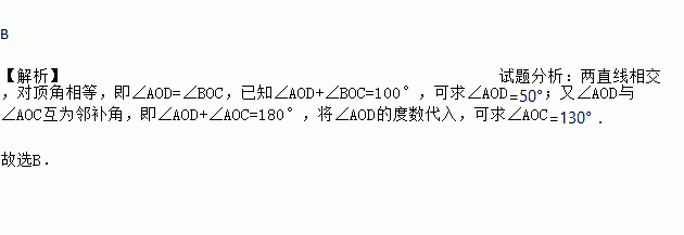 如图所示,直线AB、CD相交于点O,且∠AOD+∠BOC=100°,则∠AOC是( ).