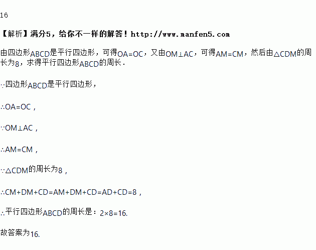 如图,?ABCD的对角线相交于点O,且AD≠CD,过点O作MO⊥AC,交AD于点M.如果△CDM的周长为8,那么?ABCD的周长是________.