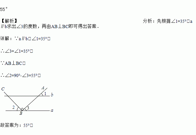 如图,a∥b,点B在直线a上,且AB⊥BC,∠1=35°,那么∠2=_____.