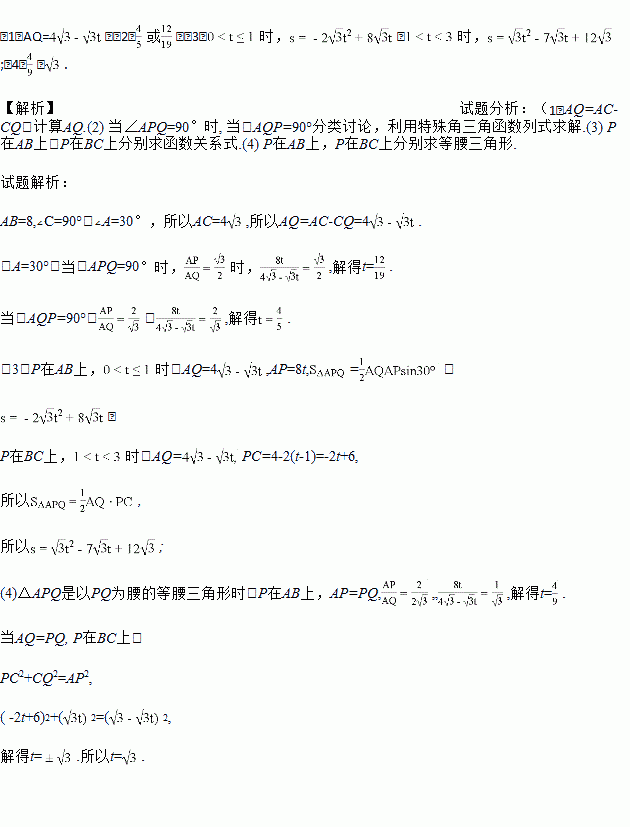 (4)当△APQ是以PQ为腰的等腰三角形时,直接写出t的值.