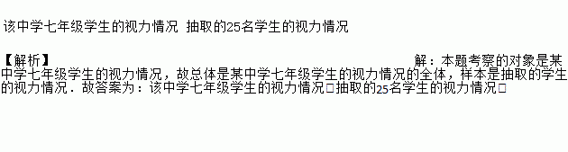 某中学要了解七年级学生的视力情况,在全校七年级学生中抽取了25名学生进行检查,在这个问题中,总体是________________________,样本是________________________.