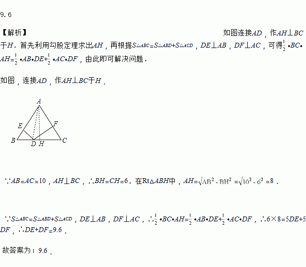 在等腰三角形ABC中,AB=AC=10,BC=12,D为BC边上的任意一点,过点D分别作DE⊥AB,DF⊥AC,垂足分别为E,F,则DE+DF=______.
