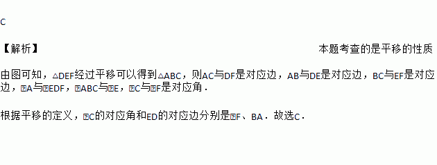 如图所示,△DEF经过平移可以得到△ABC,那么∠C的对应角和ED的对应边分别是( )