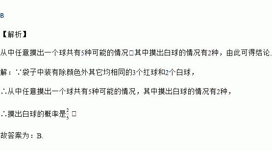 在一个不透明的袋子中装有除颜色外其它均相同的3个红球和2个白球,从中任意摸出一个球,则摸出白球的概率是( ).