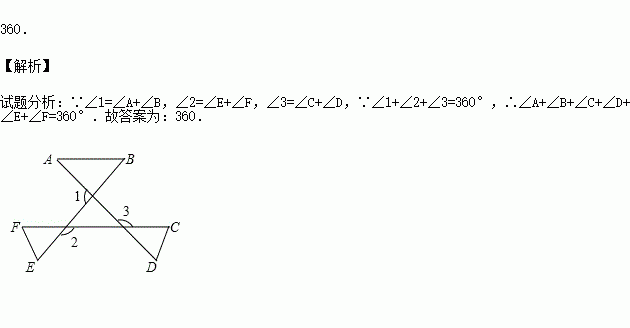 如图,∠A+∠B+∠C+∠D+∠E+∠F= ° .