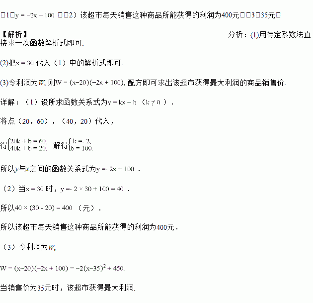 某超市以20元/件的价格购进一批商品,根据前期销售情况,每天销售量y(件)与该商品的销售价x(元)之间的函数图象如图所示.