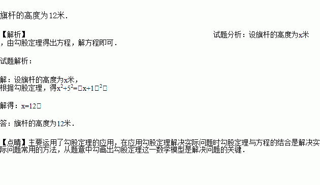 如图,小明将升旗的绳子拉到旗杆底端,并在绳子上打了一个结,然后将绳子拉到离旗杆底端5米处,发现此时绳子底端距离打结处约1米,请算出旗杆的高度.