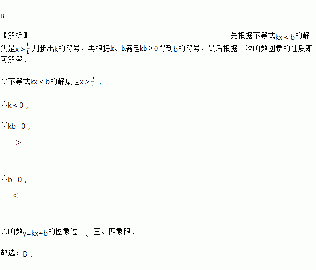实数k、b满足kb﹥0,不等式kx<b的解集是 那么函数y=kx+b的图象可能是( )
