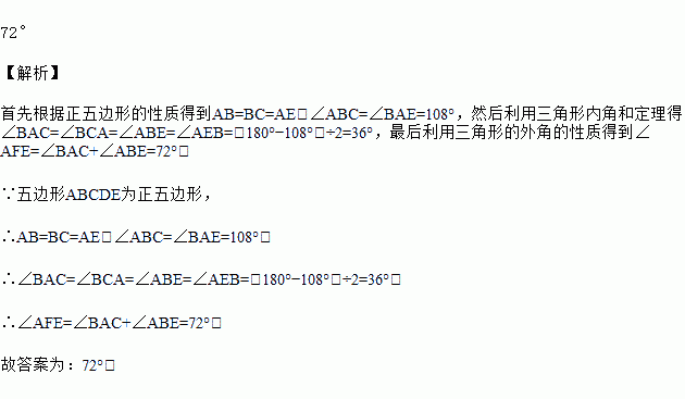 如图,在正五边形ABCDE中,AC与BE相交于点F,则∠AFE的度数为_____.