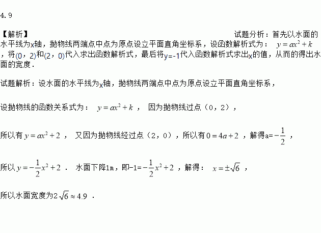 如图4所示,一座抛物线型拱桥,桥下水面宽度是4m,拱高是2m,当水面下降1m后,水面宽度是多少?(,结果保留0.1m)