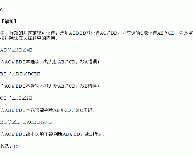A. ∠3=∠4 B. ∠D=∠DCE C. ∠1=∠2 D. ∠D+∠ACD=180°