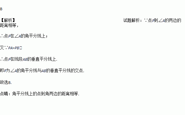 如图,已知△ABC,求作一点P,使P到∠A的两边的距离相等,且PA=PB.则对点P位置 的判断,正确的是( )