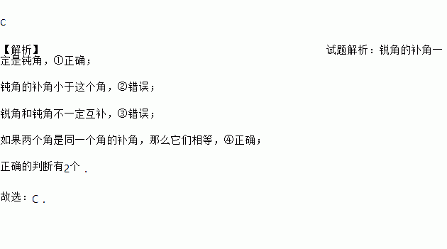 C 【解析】试题解析:锐角的补角一定是钝角,①正确; 钝角的补角小于这个角,②错误; 锐角和钝角不一定互补,③错误; 如果两个角是同一个角的补角,那么它们相等,④正确; 正确的判断有2个. 故选:C.