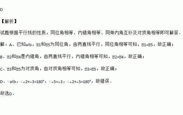 A. ∠1=∠5 B. ∠2=∠4 C. ∠3=∠5 D. ∠5=∠2