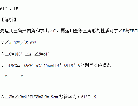 已知△ABC≌△DEF,A与D,B与E分别是对应顶点,∠A=52°,∠B=67°,BC=15cm,则∠F=________,FE=_________cm.