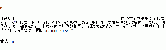 B 【解析】由科学记数法的表示形式为a×10n的形式,其中1≤|a|<10,n为整数.确定n的值时,要看把原数变成a时,小数点移动了多少位,n的绝对值与小数点移动的位数相同.当原数绝对值>1时,n是正数;当原数的绝对值<1时,n是负数.因此3120000=3.12×106. 故选:B.