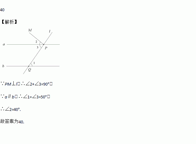 如图,直线a∥b,直线l与a相交于点P,与直线b相交于点Q,PM⊥l于点P,若∠1=50°,则∠2=__°.