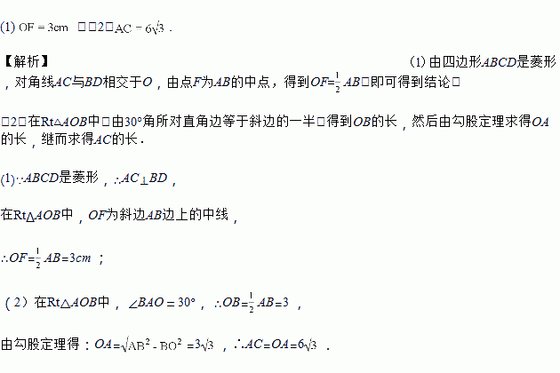 如图,四边形ABCD是菱形,对角线AC与BD相交于O,AB=6cm, ∠BAO=30°,点F为AB的中点.