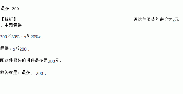 一件服装标价是300元,以8折销售,至少可获利20%,则这件服装的进价_____是_____元(第一空填“最多”或“最少”)