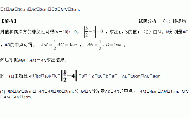 (1)AB=10cm,AC=8cm;(2)MN=3cm. 【解析】试题分析:(1)根据绝对值和偶次方的非负性可得(a-10)2=0, ,求出a,b的值;(2)由M,N分别是AC,AD的中点可得, , , 然后根据MN=AM-AN求出结果. 【解析】 (1)由题意可知(a-10)2=0,=0,∴a=10,b=8,∴AB=10cm,AC=8cm. (2)∵BD=AC=8cm,...