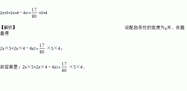 如图,一块长5米宽4米的地毯,为了美观设计了两横、两纵的配色条纹(图中阴影部分),已知配色条纹的宽度相同,所占面积是整个地毯面积的,如果设配色条纹的宽度为x米,则可列方程_____.