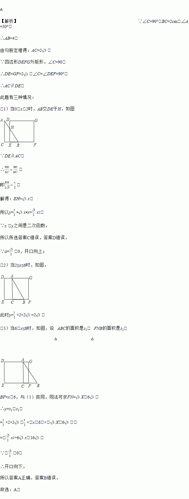 如图,△ABC为直角三角形,∠C=90°,BC=2cm,∠A=30°,四边形DEFG为矩形,DE=2