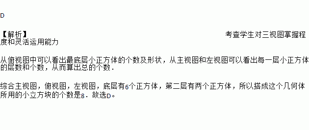 D 【解析】考查学生对三视图掌握程度和灵活运用能力 从俯视图中可以看出最底层小正方体的个数及形状,从主视图和左视图可以看出每一层小正方体的层数和个数,从而算出总的个数. 综合主视图,俯视图,左视图,底层有6个正方体,第二层有两个正方体,所以搭成这个几何体所用的小立方块的个数是8.故选D。