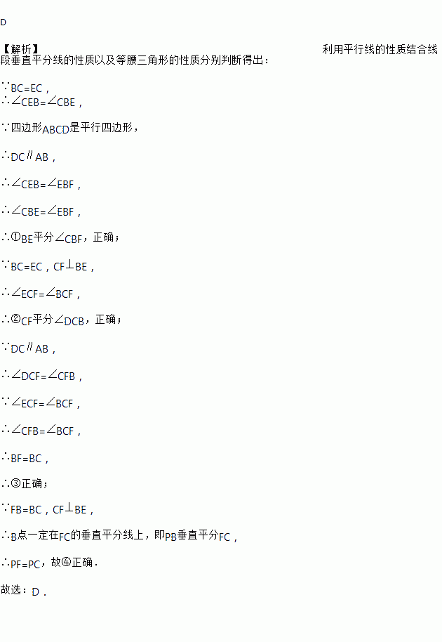 如图,四边形ABCD是平行四边形,点E是边CD上一点,且BC=EC,CF⊥BE交AB于点F,P是EB延长线上一点,下列结论:①BE平分∠CBF;②CF平分∠DCB;③BC=FB;④PF=PC,其中正确结论的个数为( )