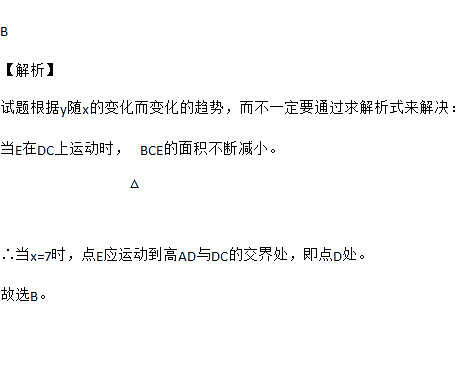如图1,在矩形ABCD中,动点E从点B出发,沿BADC方向运动至点C处停止,设点E运动的路程为x,△BCE的面积为y,如果y关于x的函数图象如图2所示,则当x=7时,点E应运动到