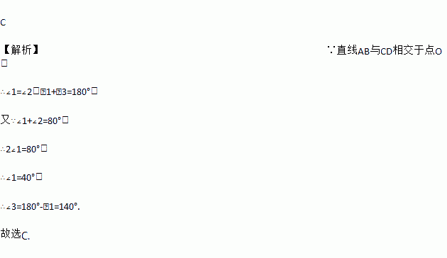 如图,直线AB与CD相交于点O,若∠1+∠2=80°,则∠3等于( )