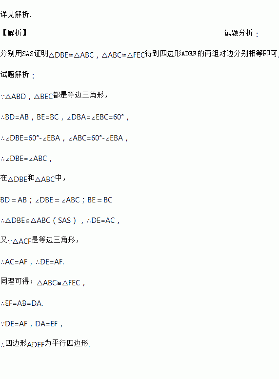 如图,已知△ABC,分别以它的三边为边长,在BC边的同侧作三个等边三角形,即△ABD,△BCE,△ACF,求证:四边形ADEF是平行四边形。