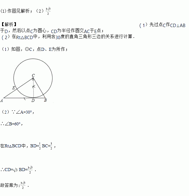 (2)在你按(1)中要求所作的图中,若BC=3,∠A=30°,CD的长是