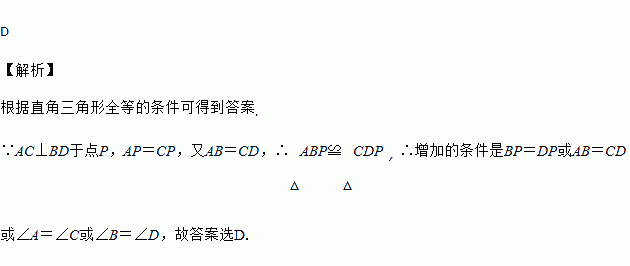 如图,AC⊥BD于点P,AP=CP,增加下列一个条件:①BP=DP;②AB=CD;③∠A=∠C.其中能判定△ABP≌△CDP的条件有 ( )