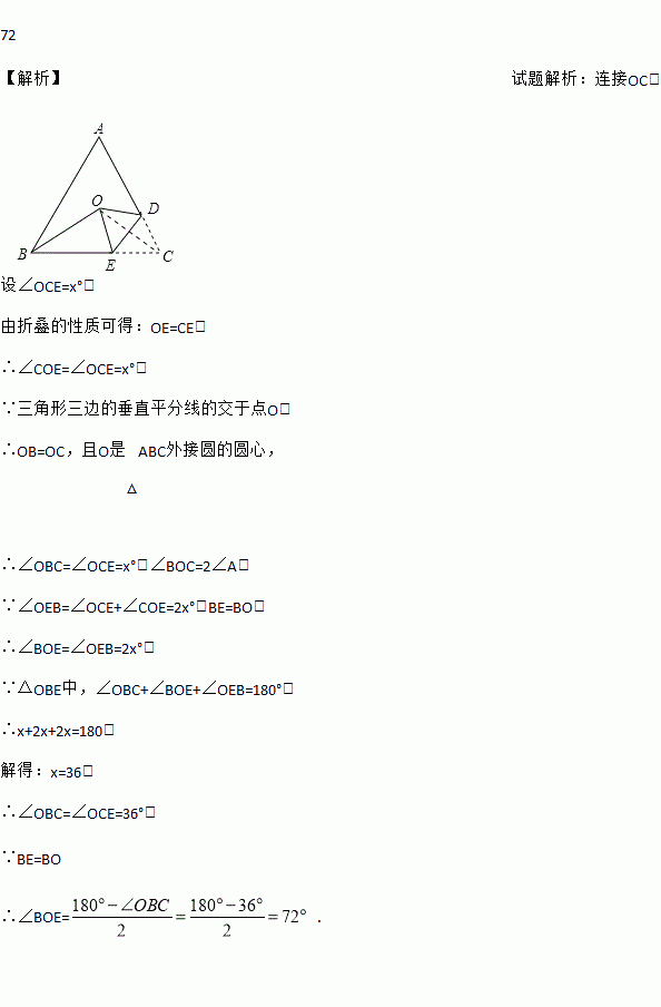 Èçͼ£¬ÔÚ¡÷ABCÖУ¬½«¡÷ABCÑØDEÕÛµþ£¬Ê¹¶¥µãCÂäÔÚ¡÷ABCÈý±ßµÄ´¹Ö±Æ½·ÖÏߵĽ»µãO´¦£¬ÈôBE=BO£¬Ôò¡ÏBOE=____________¶È£®