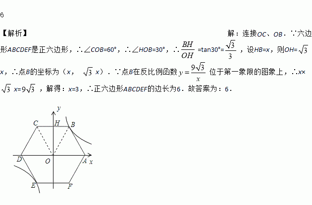 如图,在平面直角坐标系中,正六边形ABCDEF的对称中心与原点O重合, 点A在x轴上,点B在反比例函数位于第一象限的图象上,则正六边形ABCDEF的边长为______________;