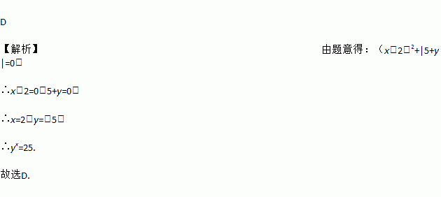 D 【解析】由题意得:(x-2)2+|5+y|=0, ∴x-2=0,5+y=0, ∴x=2,y=-5, ∴yx=25. 故选D.