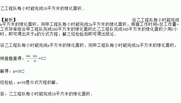 某社区积极响应正在开展的“创文活动”,组织甲、乙两个志愿工程队对社区的一些区域进行绿化改造.已知甲工程队每小时能完成的绿化面积是乙工程队每小时能完成的绿化面积的2倍,并且甲工程队完成300平方米的绿化面积比乙工程队完成300平方米的绿化面积少用3小时,乙工程队每小时能完成多少平方米的绿化面积?