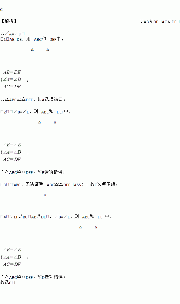 C 【解析】∵AB∥DE,AC∥DF, ∴∠A=∠D, (1)AB=DE,则△ABC和△DEF中, , ∴△ABC≌△DEF,故A选项错误; (2))∠B=∠E,则△ABC和△DEF中, , ∴△ABC≌△DEF,故B选项错误; (3)EF=BC,无法证明△ABC≌△DEF(ASS);故C选项正确; (4)∵EF∥BC,AB∥DE,∴∠B=∠...