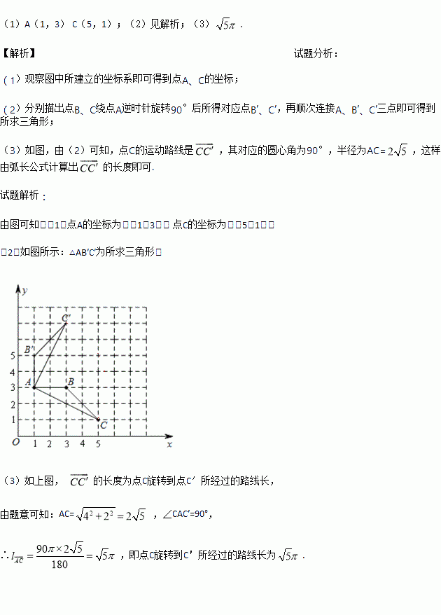 如图:(1)写出△ABC中点A、点C坐标;(2)画出△ABC绕点A管好逆时针旋转90°后的△AB'C';(3)在(2)的条件下,求点C旋转到C'所经过的路线长。(结果保留)