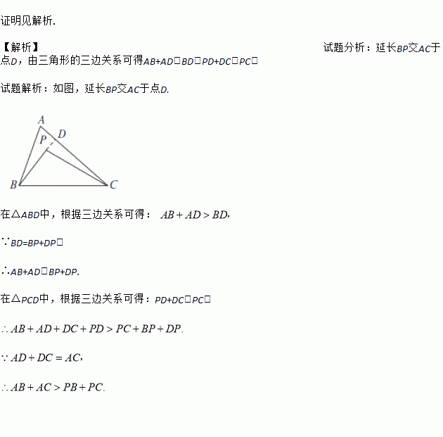 已知:如图,P是△ABC内任一点,求证:AB+AC>BP+PC.