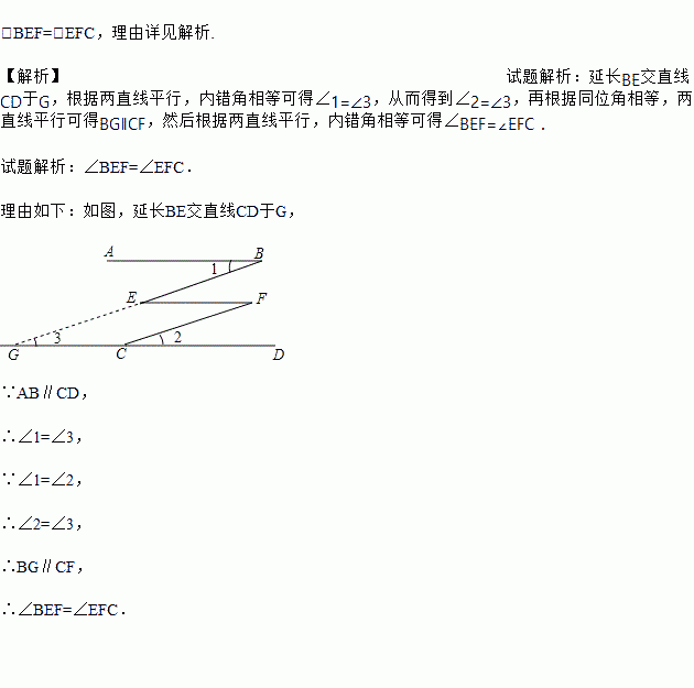 如图,AB∥CD,∠1=∠2,∠BDF与 ∠EFC相等吗?为什么?