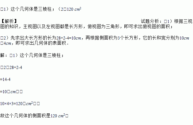 (2)若俯视图中等边三角形的边长为4cm,主视图中大长方形的周长为28cm,求这个几何体的侧面积.