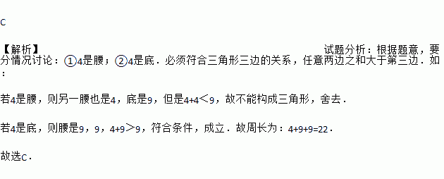 一个等腰三角形两边的长分别为4和9,那么这个三角形的周长是( )