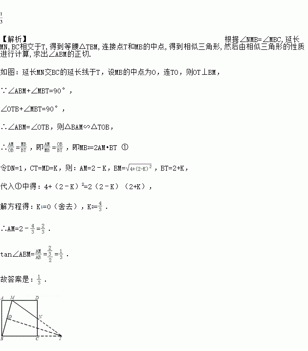 在正方形ABCD中,N是DC的中点,M是AD上异于D的点,且∠NMB=∠MBC,则tan∠ABM=_____.