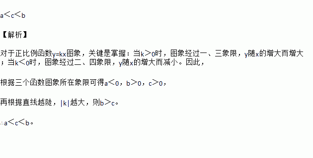 如图,三个正比例函数的图象分别对应表达式:①y=ax,②y=bx,③y=cx,将a,b,c从小到大排列并用“<”连接为 .