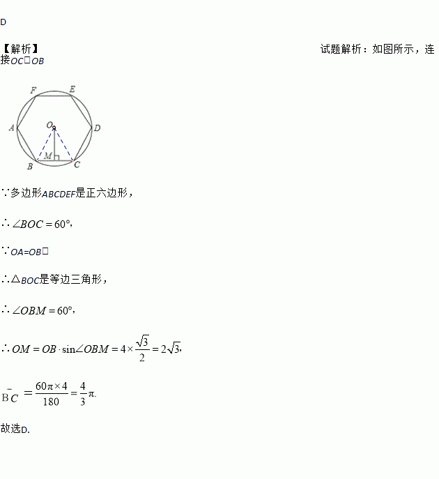 如图,正六边形ABCDEF内接于⊙O,半径为4,则这个正六边形的边心距OM和弧BC的长分别为( )